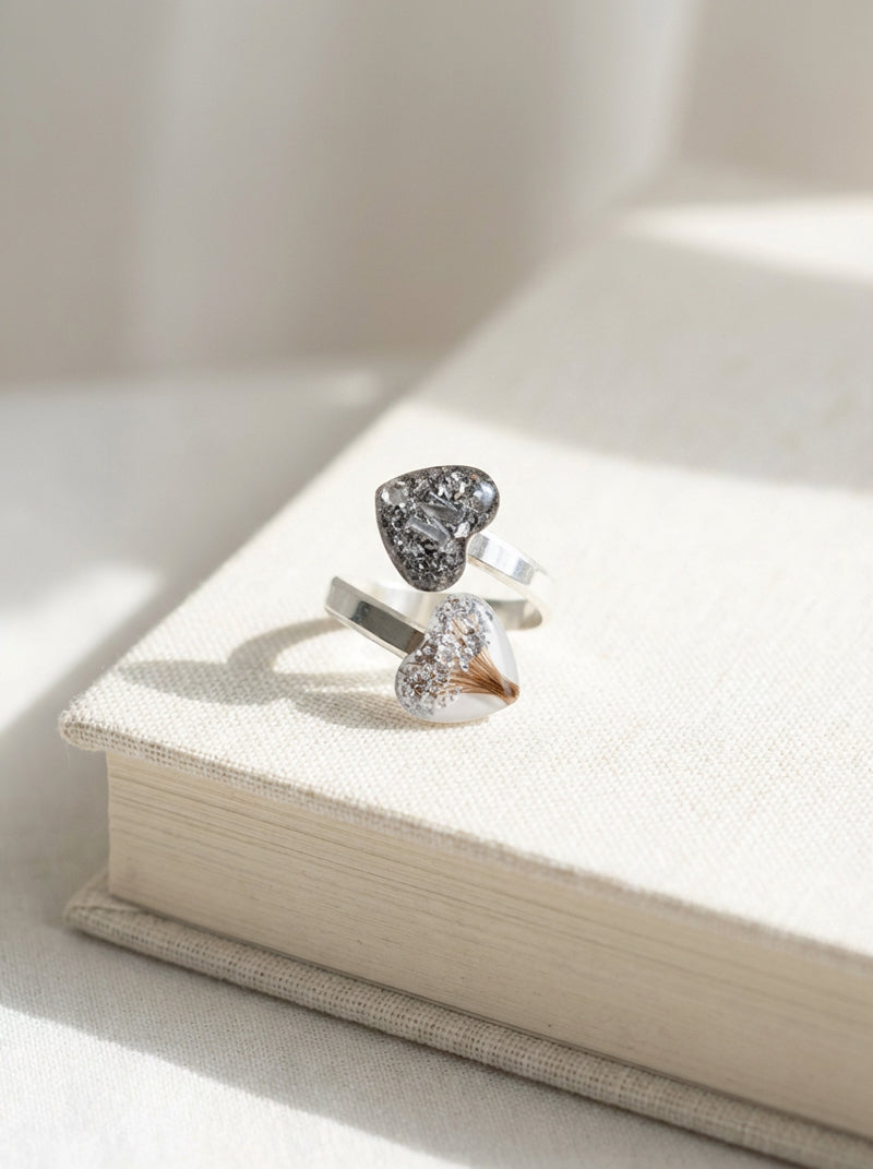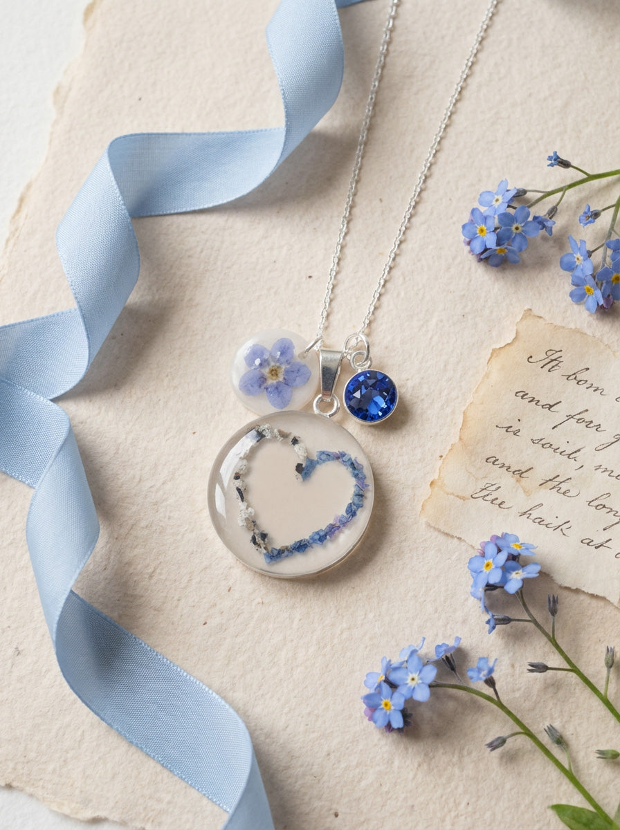 Diese persönlichen Elemente werden behutsam in hochwertigem Harz eingebettet, auf Wunsch ergänzt mit Glitzer, Blattmetall oder Texten. Nach dem Aushärten wird das Schmuckstück von Hand geschliffen, poliert und zu einem liebevollen Gedenkschmuck verarbeitet – ein Stück Erinnerung, das dich jeden Tag begleitet.